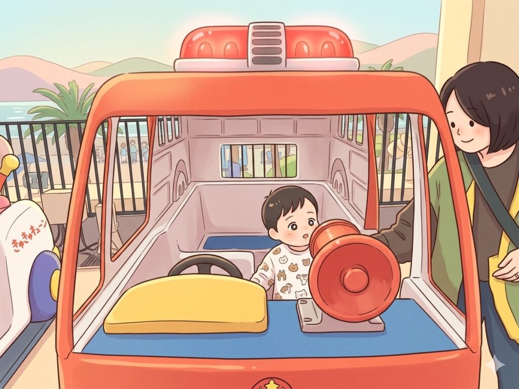 ベビーちゃんは消防車のハンドルを握って消防士になりきり!