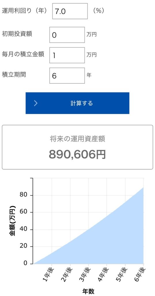 毎月1万円を利回り7%で運用し続けて6年間のシミュレーションをしてみても、